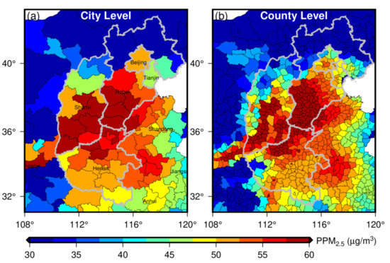 The high-resolution PM2.5 product enabled us to investigate air pollutions in urban cities on more fine-scale. The annual mean PPM2.5 concentrations at the city and county levels in the North China Plain were calculated to study the detailed exposures in highly polluted areas of China (Figure 10). From the view of the city level, the high PPM2.5 areas (>57.5 µg/m3) were aggregated and mainly located in southern Hebei, southern Shanxi and northern Henan. Beijing and Tianjin showed lower PPM2.5 than the southern Hebei, mainly attributed to the strict control policies of local governments in recent years. The PPM2.5 at the county level presented more detailed spatial patterns. Figure 10b illustrated that the high PPM2.5 areas in southern Hebei Province were more agglomerate than Shanxi and Henan Provinces, indicating the heaviest PM2.5 pollutions and highest health risks in these areas.