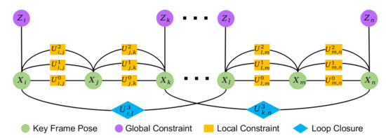 The pose graph that we constructed is shown in Figure 4. It integrates multiple sensor input data and outputs the optimized poses . Specifically, the following types of factors are involved: the motion prior factor from the IMU/wheel encoder [34,35], the scan-to-scan matching factor , the scan-to-submap matching factor , the loop closure factor , and the integrated GNSS/INS factor . For brevity, , , and are all named as the local constraints (as shown with orange squares in Figure 4).