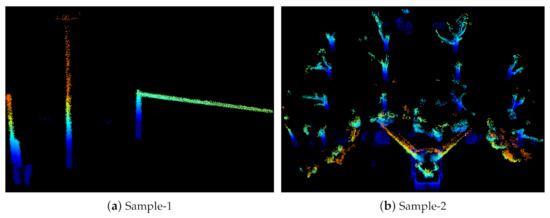 (I) Data preprocessing. This module is to preprocess the LiDAR point cloud, as shown in Figure 3. It includes three parts: keyframe selection, intra-frame compensation, and noise removal. Keyframes are selected based on the minimum odometric displacement (we set 1.0 m translation or 10 degree rotation). Distortion caused by LiDAR ego-motion is compensated through IMU/wheel encoder outputs [34,35]. We consider the moving objects as noise to the mapping system. They are filtered out by a multi-object detection and tracking method [36,37,38], as shown in Figure 3c. In the off-road environment, there might be floating dust as the wind blows, as shown in Figure 3d. These floating dust particles are removed by a specifically designed algorithm [39].