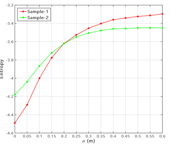 where is the covariance matrix of the point set in a certain neighborhood of . The local radius is set to 0.5 m and is valid when the size of is larger than 5. The entropy is calculated for each point and the average is calculated as: