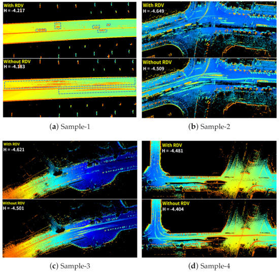Removal of dynamic vehicles: The comparison results with and without the removal of dynamic vehicles (RDV) are shown in Figure 8. As shown in Figure 8, the ghost shadows caused by moving vehicles (highlighted with blue dotted boxes in Figure 8a) are mostly filtered out by the proposed mapping system. Furthermore, the decrease in after the removal of dynamic vehicles suggests that the map quality has been improved.