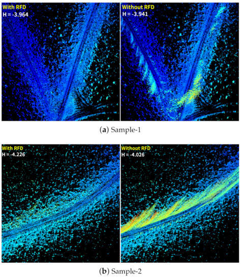 Removal of floating dust: Two comparative mapping results with and without the removal of floating dust (RFD) in off-road scenarios are shown in Figure 9. It is obvious that the map quality has been improved after the removal of floating dust.