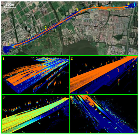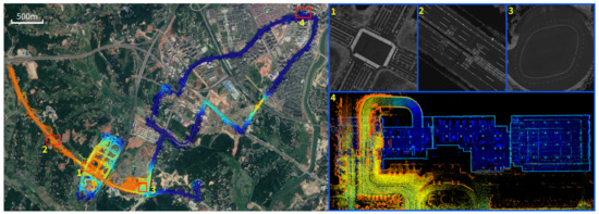 Mapping results in challenging city scenarios: The mapping system is tested in a complex city scenario, including the city road under a bridge, highways, and an underground parking garage, as shown in Figure 18. Moreover, the data were collected during a high-traffic period, when the vehicle was always surrounded by many other moving objects. It is observed that the lane markings on the ground are clearly visible in the enlarged 2D grayscale maps (as shown in close views 1–3 of Figure 18). The high-precision 3D point cloud map of the underground parking garage suggests that the mapping system could accurately map the area without the GNSS signal, and the built map could be seamlessly aligned to the area with the GNSS signal.
