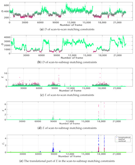 where and are scale factors. The values of D and E are calculated for each scan-to-scan and scan-to-submap registration, and the results are shown in Figure 12a–d. Frames with lower D or higher E are more prone to degeneration and they are highlighted in pink. These frames are mostly captured on the highway, with less geometrical structures, or surrounded by many vehicles, as shown in sub-figures 2 and 3 in Figure 10. Furthermore, the scan-to-submap matching constraints have larger D and smaller E than the scan-to-scan matching constraints. Therefore, the scan-to-scan matching constraints are generally more prone to degeneration than the scan-to-submap constraints.