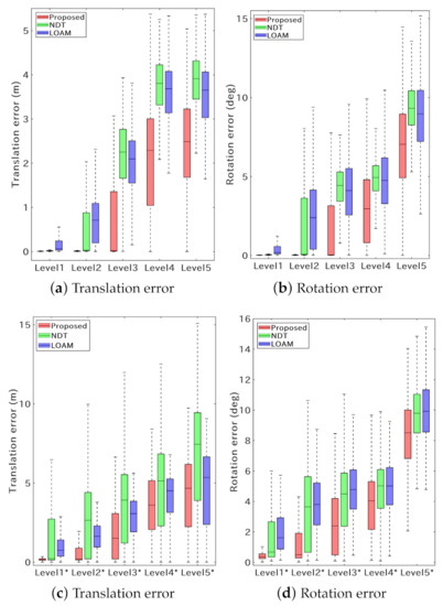 We choose NDT and LOAM as the baseline approaches. Figure 14 shows the error statistics of loop closure registration. Overall, the proposed method obtains the best performance at all levels of difficulty for both two groups. Furthermore, Figure 15 shows the proportion of correct loop closure registrations. We compare the registration result with the ground truth. It is considered as a correct registration if the translation error is less than 0.2 m and the rotation error is less than 0.5 degrees. Based on Figure 14 and Figure 15, the proposed approach performs best in both the overall accuracy and the success rate.