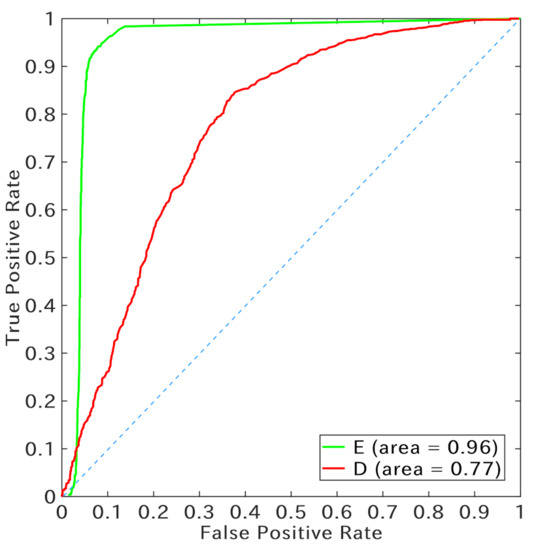 ROC curves for the degeneracy indicators E and D. This evaluation is performed using a total of 4230 pairs of loop closures, including 2031 positive (matching) pairs and 2199 negative (non-matching) pairs.