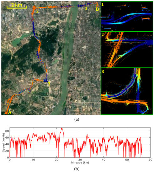 Large-scale mapping: Finally, the mapping system was also tested in a large-scale highly dynamic urban scenario. As shown in Figure 21, two sets of data were collected. The first dataset was collected from A to B on 3 September 2019 and the second dataset was collected from B to A on 28 July 2020. The total driving length is 56.3 km and the driving speed is shown in Figure 21b. A large number of dynamic vehicles make the scan matching tend to degenerate, especially over the high bridges. Moreover, GNSS signal blockage frequently occurs due to tall buildings. These problems are handled well by the degeneration analysis proposed in this paper.