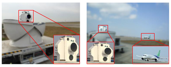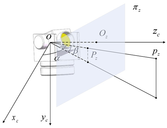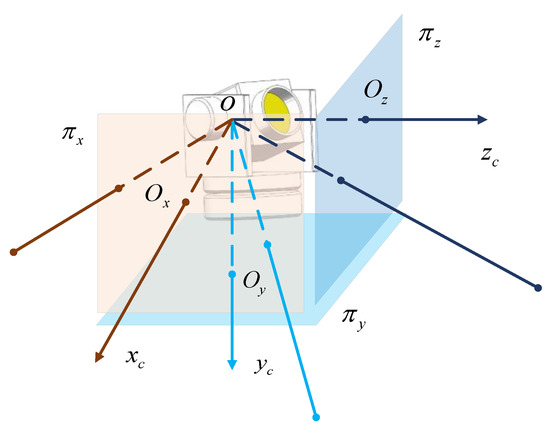 The system comprises a two-degree-of-freedom turntable and an auto-long-zoom camera, and the measuring distance of which is in the range 50–5000 m. The zoom camera is mounted in the turntable’s inner frame, and its optical axis is collinear with the direction of the pitch. The system is considered a virtual omnidirectional camera with three mutual orthogonal image planes , , and that transfer the realistic azimuth and pitch to the virtual image coordinates, as shown in Figure 2.