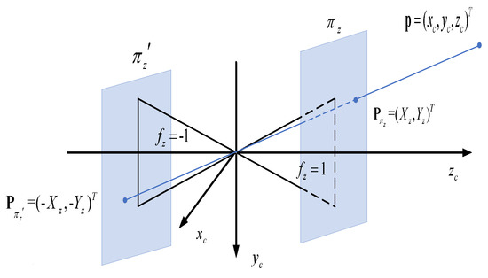 The virtual image coordinate is used in the form of homogeneous coordinate, so the virtual image coordinate is free from multiplying a non-zero scale factor. In particular, in our virtual omnidirectional camera, when the homogenous coordinate is multiplied by −1, it is equivalent to imaging in the virtual image plane with “focal length −1”. Therefore, there are other three virtual imaging planes separately with focal length with , with , and with . Therefore, there are actually six virtual mutual orthogonal image planes, and they are constructed as a cube.