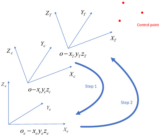 After the abovementioned procedures, the location and attitude in are obtained, but they are not convenient for demonstration and application in practice. Our approach is to transform them into the local coordinate system , which is situated in the local level and shown in Figure 5.