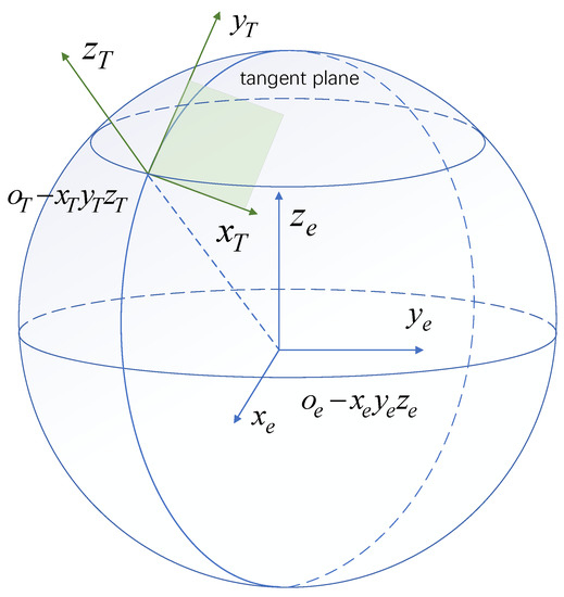 is a LTP coordinate system. Right-handed variants denoted by East, North, and Up (ENU) coordinates are used [40]. 3D coordinate axes ,, and are separately defined by the directions of East, North, and upward vertically to the local level. They serve for representing the state of location and attitude that is commonly used in the aviation domain.