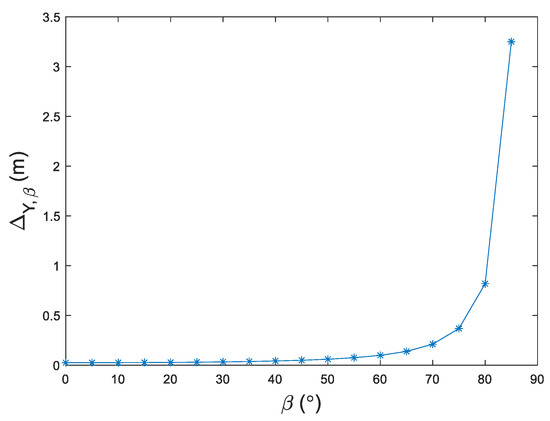 Second, the influence to , which is introduced by , was analyzed. is equal to 0.05°, and the azimuth is set as . The error of virtual image coordinate imported by pitch is denoted by , and it is a derivative of Equation (2):