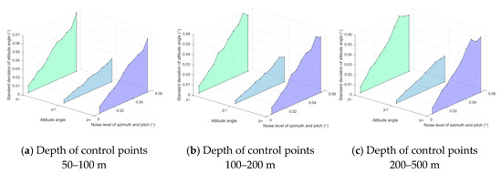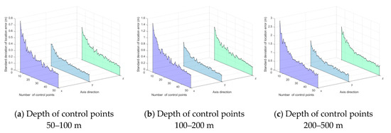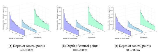 An experiment was conducted to evaluate the method’s accuracy with respect to a different number of control points, . The control points’ depths vary in the different ranges, i.e., 50–100, 100–200, and 200–500 m. Both the azimuth and pitch are in the range . Gaussian noise with 0 mean and standard deviation 0.05 () is added to azimuth and pitch . Gaussian noise with 0 mean and standard deviation 1.5 × 10−2 (m) is added to control point . For each number of control points, 1000 independent trials were performed. The standard deviation of location error (SDLE) is the metric for location accuracy, and the standard deviation of attitude angle error (SDAAE) is the metric for attitude accuracy. The results are shown in Figure 12 and Figure 13, respectively. When the number of control points increases, both SDLE and SDAAE decrease. In case (a), when , , , , = 0.22 m, = 0.11 m, and = 0.16 m.