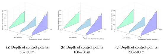 An experiment was conducted to evaluate the accuracy with respect to different angle noises. The number of control points is 50. The depth of the control points is 50–100, 100–200, and 200–500 m. Both azimuth and pitch are in the range . Gaussian noise with 0 mean and standard deviation () is added to azimuth and pitch . Gaussian noise with mean 0 and standard deviation (m) is added to the control point . For each noise level, 1000 independent trials were performed. The SDAAE and SDLE results are shown in Figure 14 and Figure 15, SDLE vs. angle noise , respectively.