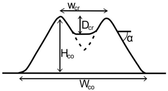 Relationships between volcanic parameters. Wcr = crater width, Dcr = crater depth, Hco = cone height, Wco = basal width of cone, α = maximum slope angle (based on [2]).