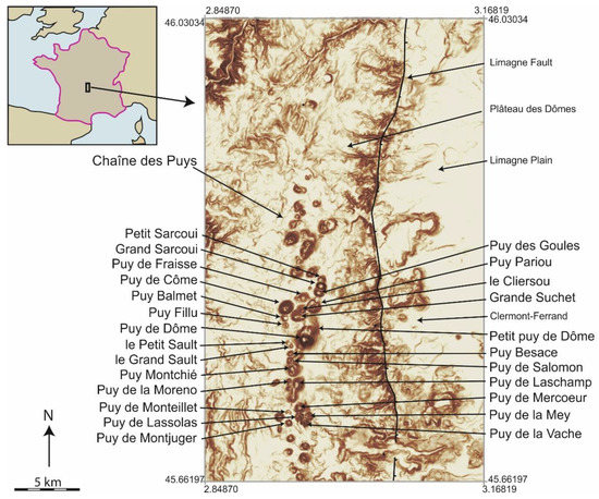 The study area here is the Chaîne des Puys, Auvergne, France (Figure 2). This is a compact alignment of more than 80 monogenetic volcanoes, long renowned for their diversity and variability [23,24,25]. The volcanoes are now part of a UNESCO World Heritage site [26]. The cones vary from simple basaltic cones to evolved trachyte domes and have a full range of volcano-geomorphic features such as small to large craters, breached craters, 10s m to 100s m-high cones, and complex flank geometries reflecting short but complex eruptions. We have taken 25 cones (Table 1), which are mostly true scoria cones. Some trachyte domes are included (Grand Sarcoui, le Cliersou, Puy de Dôme and Petit puy de Dôme, see in Table 1) to explore their similar, but subtly distinct morphometries. The cones and domes share similar construction characteristics, in that they are both formed by accumulation of fragmented material on slopes. The difference is that cone slopes are formed of scoria thrown out by explosions, while dome slopes by the crumbling of lava extruded at the summit. The resulting slopes appear very morphometrically similar because of this parallel evolution [27]. The present geological map of the Chaîne des Puys has been developed progressively since 1975 [28] and provides a classification of the cones into their different compositions and ages that are used in this study [24].