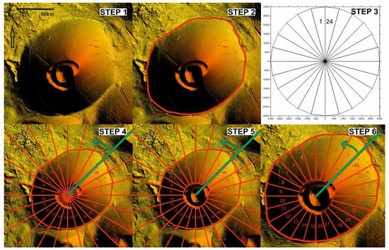 Steps #1 and #2 are de facto standard steps, which should be performed not only for sectorization, but also for any morphometric analysis of scoria cones. Nowadays, these steps are (mostly) based on digital terrain models, ideally correlated with geological maps. The base of the cone was defined as the concave break in slope between the cone slope and the surrounding terrain (e.g., as in Figure 1). In many cases, this was the low slope plateau, and, in others, a sharp slope change between one cone and the adjacent one (see Figure 3, Steps 1 and 2). However, the best and most realistic result can be achieved by supplementing these with field data collection. Therefore, each cone base was manually drawn and checked by several users to verify the results.