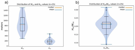 The distributions of the Wco and Hco values are plotted in Figure 4a. The median (yellow) and mean values (blue) do not differ much; however, Wco values slightly, and Hco values are considerably positively skewed (skewness(Wco) = 0.26; skewness(Hco) = 0.99).