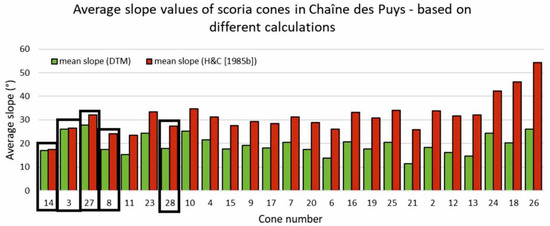 In Figure 6, two average slope values are plotted. Red columns represent the mean slope calculated using the H&C [35] equations and green columns represent mean slope derived from the DTM (whole cone values). The order of the scoria cones is as follows: we examined the results obtained with the two types of calculations and arranged them in ascending order according to their differences. Cones framed in black are those that do not have a crater (four of them are domes): we can see that the difference between them is the smallest. Mean slope values calculated using the equations of H&C [35] are higher than values derived from DTM: in some cases, these are unrealistically high values. This overestimation has important implications: if we use the more realistic average slopes, the age/slope relationship seems to be more reliable (see 4. Discussion).