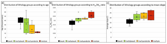 Following Hooper and Sheridan [21], Mann–Whitney tests were performed to compare the parameter distributions between four groups with different lithologies (Figure 5c,d, also see Table 1). Using a significance level of α = 0.05, the statistical tests were done for the four groups comparing age, Hco/Wco and mean slope angle (DTM) (Figure 7). For Hco/Wco, the basaltic, trachybasaltic, trachyandesitic, and trachytic group display progressively higher values, to some extent correlating with progressively younger ages, whereas, for mean slope, this relationship is less pronounced, and only the basaltic cones (being less steep) can be distinguished from the latter three lithological groups, which show higher but overlapping slope values. The Hco/Wco, values also significantly separate the trachyte from the trachyandesite lithologies, and, according to the average slope, the basaltic group is separated from the trachybasaltic one.