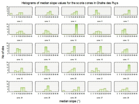 For the sectorization division, minimum, maximum, mean, median, and mode values were calculated for each sector (24) of the 25 examined cones. There are two cones that have been so destroyed (either by volcanogenic processes or post-eruptional erosion) that certain sectors are missing (cones 2 and 26). As was explained in Section 2.2.2, the starting (main) direction of the sectors was influenced by the shape of the cone. The other dominant direction is perpendicular to this main direction. These two imaginary lines gave the smallest and largest diameters of the scoria cone in most cases (used in Results), and they split the whole cone into quarters. With these quarters, the cone can be well characterized in terms of symmetry (see later). In Figure 8, the histograms of the median slope angles are plotted.