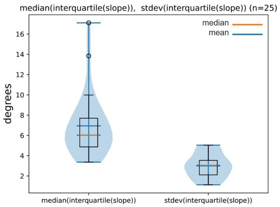 It is quite straightforward to study the interquartile values (differences of the values at 75% and 25% of the distribution) to assess how compact the distributions are. As many authors assumed that the slope distribution is typically rather peaked because of the apparent symmetry of the cones, we found it informative to present the interquartile distributions of the slopes (whole cone) for the studied individual edifices. In the case of highly regular cones, the median values of interquartile range should be relatively low (all sectors should be similar), and the standard deviation of the interquartile ranges should be close to zero (all distributions of the sectors should be similar). Figure 9 shows the results for the studied cones.