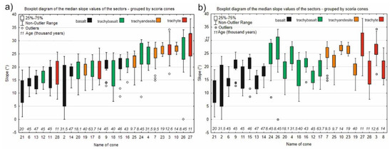In Figure 10a,b, boxplot diagrams of the median slope values of the sectors can be seen, supplemented with information on lithology and age. In Figure 10a, the cones were plotted according to increasing median values. The figure suggests the same conclusion that we can draw from Figure 7c: the slope values are constrained by the lithological characteristics rather than by age. In order to emphasize this conclusion in Figure 10b, the cones were grouped by the lithology and then, within the groups, arranged according to their age.