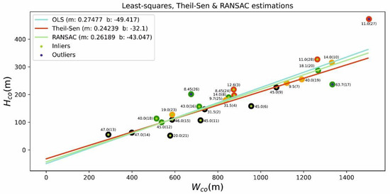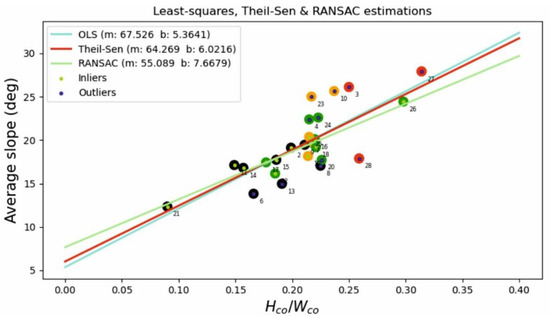 Modeling of average slope Wco/Hco relationship using the ordinary least squares method (OLS), Theil–Sen estimation, and RANSAC algorithm. The values indicated are the IDs of the cones.