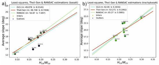 Figure 13. Modeling of average slope and Hco/Wco relationship of (a) basalt (b) trachybasalt cones using the ordinary least squares method (OLS), Theil–Sen estimation, and RANSAC algorithm. The values indicated are the ages of the cones, and the IDs (see Table 1) are indicated in brackets.