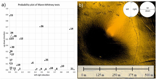 (a) probability plot of Mann-Whitney tests comparing the distributions of the left-right and up-down (forward backward) sectorial parts of each considered cones. The higher the value, the more symmetric the cone is in that directional sense; (b) cone 14, which is the most symmetric one according to the chart in the left panel. The definition of the two symmetry axes is right above.