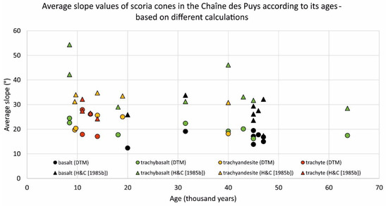 Summary of slope values based on H&C equations [35] (dots) and DTMs (triangles) according to its ages. Coloring is based on lithology (black: basalt, green: trachybasalt, yellow: trachyandesite, red: trachyte).