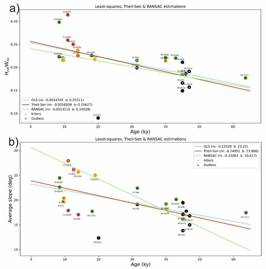 (a) regression models for age vs. Hco/Wco ratio. All three models are similar with many outliers; (b) regression models for age vs. (DTM-based) average slope. RANSAC results in a completely different model, whereas the results of ordinary least squares fit and Theil–Sen estimator are similar.