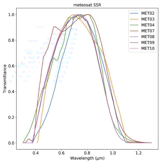 In order to enable a comparison among different Meteosat satellites and among data records derived from different satellite instruments, the albedo quantities retrieved with GSA must be converted into a larger common spectral broadband interval (0.3–3.0 µm). The broadband albedo conversion is performed from the native instrument visible channel of MVIRI (Meteosat-2 to Meteosat-7) or the High-Resolution Visible (HRV) channel of SEVIRI (Meteosat-8 to Meteosat-10). Figure 1 shows the differences in the spectral bands of the used channels and this will result in a different spectral albedo value retrieval. As already mentioned, in this paper the DHR is used for analysis, but for the sake of completeness, the conversion is here extended to the BHR The conversion to broadband is done for MVIRI (Meteosat-2 to Meteosat-4) following the method described in [] and for MVIRI (Meteosat-5 to Meteosat-7) and SEVIRI (Meteosat-8 to Meteosat-10) following the method described in []. The need for two methods is due to an issue in the nominal Sensor Spectral Response (SSR) that was leading to some temporal discrepancies in the observations from Meteosat-2 to Meteosat-4. Loew and Govaerts adopted an empirical method to derive the spectral coefficients. However, the relation between spectral and broadband albedo is the same for both methods and is given by a third-order polynomial (Equation (1)):
