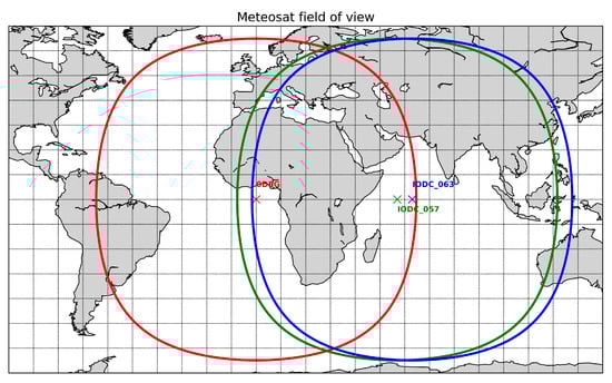 Meteosat field of view: Prime mission 0-degree (red), IODC 57-degrees (green) and IODC 63-degrees (blue).