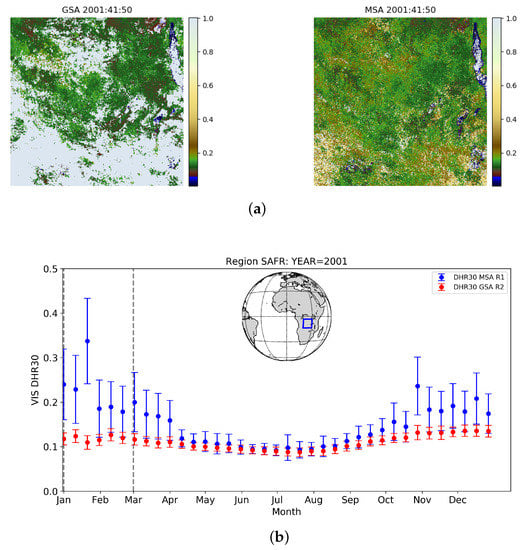 Southern Africa (SAFR) region. On the bottom plot (b), comparison of VIS DHR30 as retrieved in the region north of Equator from MSA Release 1 (blue) and GSA Release 2 (red). The season of interest is included between the two dashed vertical lines. On the upper panel (a) map comparison between GSA Release 2 (bottom left panel) and MSA Release 1 (bottom right panel) for the period 041–050 (10 to 20 of February) 2001.