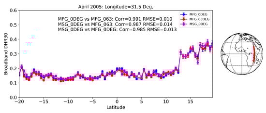 In order to assess the retrieval consistency among the different missions, a comparison of the broadband DHR30 was done for an overlapping transect. A period in April 2005 was is shown, but similar results were obtained for other periods. In order to minimize the potential discrepancies due to a different viewing geometry, the transect was chosen at the longitude of 31.5. This longitude is exactly in the middle between the nominal locations of the 0 mission (both MFG and MSG) and the IODC mission at 63. Figure 5 shows the very good agreement between the retrievals from the first (Meteosat-5 and -7) and second generation (Meteosat 8) of imagers. The DHR30 correlation is always higher than 0.98. Table 5 summarizes the statistics (correlation, the Mean Absolute Error (MAE) and Root Mean Square Error (RMSE)).