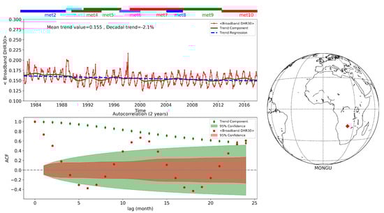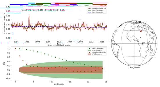 where Y is the observed parameter (DHR30), T is the trend component, S is the additive seasonal component, and R is the remainder component, for each observation at time t (t = 1... N number of observations). The Mean Trend Value is the mean value of T over the full period. A linear regression (linear fit of T) on the trend component allowed estimating the decadal trend (Figure 6 and Figure 7, upper plot). In order to confirm that any seasonality from the input time series has been removed, an Auto Correlation Function (ACF) plot has also been computed up to 24 lags (2 years, 24 months). The objective is to test the hypothesis that the time series is auto correlated due to a seasonal component. This component is present, as expected, for the MONGU urban site (Figure 7, bottom plot) in the input broadband DHR30 (red dots) array, but it disappears when looking at the trend component (green diamonds). The shaded areas indicates the upper and lower bounds of the 95% confidence level (only lags inside this area are statistically significant). The same analysis for the LIBIA_00001 desert site (Figure 6, bottom plot) shows, as expected, no clear seasonality. The above trend-seasonal-residual decomposition procedure has been performed for all selected sites (see Table 3). The decadal trend over more than thirty-six years and nine different platforms is close to 1% (LIBIA_00001, EGYPT_ONE, SOV, see Table 6) for all bright desert sites, the scrubland site (SKUKUZA) and forest site (BELMANIP_00025) as listed in Table 3. The MONGU site shows a decrease of about 2% per decade. For the MONGU site, the seasonal variations (see Figure 7) are due to surface dynamics that are linked to the precipitation regime and/or to minimal residual cloud contamination in the input cloud mask. Such variations are not present for the LIBIA_00001 site (see Figure 6), where the issue of potential minimal undetected clouds is much less relevant due to the much lower average annual cloud coverage of that site.