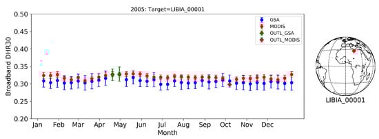 Comparison between DHR30 GSA (Meteosat-8) and MODIS for year 2005 for the site LIBIA_00001. Two GSA and one MODIS retrievals have been flagged as outliers.