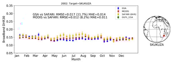 The results presented in Figure 8 and Table 7 confirm the good agreement between GSA and MODIS, with PERC values for DHR30 ranging between 2% and 7% for bright desert sites, and with value between 8% and 9% for the urban (MONGU), vegetation (BELMANIP_00025), and shrubland (SKUKUZA) sites. The comparison versus SAFARI (see Figure 9 and Table 8) shows a worse agreement, with PERC values of 21%. Although, the comparisons of SAFARI (BHR) versus MODIS and GSA (DHR30) show similar RMSE and PERC values, the MAE value of the comparison versus GSA is higher than the corresponding value for MODIS. The latter is an indication of the presence of residual clouds not screened out by the cloud mask, which is confirmed by the significantly higher AVG values of GSA than of MODIS (see Table 7). For the SKUKUZA site the differences between the GSA vs SAFARI and MODIS vs SAFARI are much smaller, with slightly higher RSME, PERC, and MAE values for GSA. The AVG values for GSA and MODIS are almost identical (see Table 8).