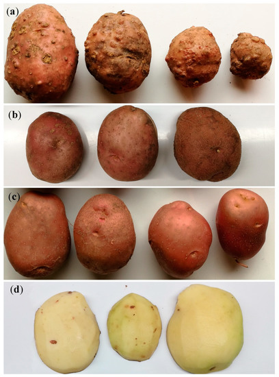 Cv. Desiree potato tubers after harvesting: (a) potato tubers from the RKN treatment with visible infestation symptoms—surface galls on potato tubers; (b) potato tubers from the RKN treatment without visual symptoms (i.e., latent infestation); (c) healthy, uninfested potato tubers from the control treatment; (d) peeled potato tubers from the RKN treatment without visual symptoms when unpeeled, with few visible necrotic spots below the potato tuber skin when peeled.