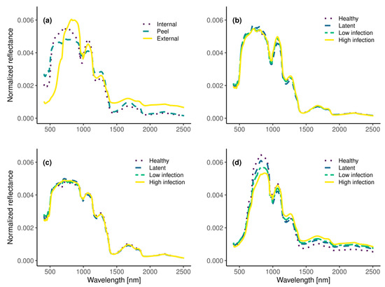 Mean spectral signatures of all groups. (a) Tuber preparation groups; (b) internal data from halved tubers; (c) data from peels; (d) epidermis data.
