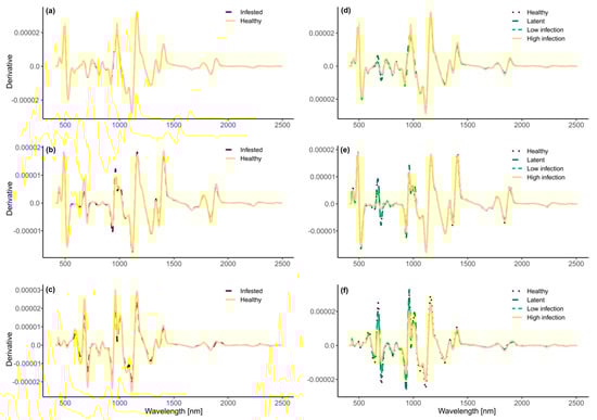 Savitzky–Golay derivative spectra. Left column: distinguishing between healthy and infested tubers; Right column: distinguishing between infestation severity groups. (a,d) internal data, (b,e) peel data, (c,f) external data.