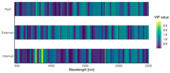 Secondly, partial least squares discriminant analysis (PLS-DA) [43] was used as a method for dimensionality reduction and feature extraction of the data. Prior to analysis, variables were weighted using standard deviation weighting. PLS-DA models were developed separately for each of the three sample types (external, peel, and internal). The relevance of each wavelength to the classification was determined by calculating the importance of the variables in the projection (VIP) [44]. The developed models were validated using leave-one-out cross-validation.