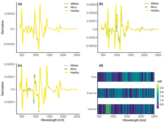 Spectral derivatives (a–c) and VIP results (d) of Meloidogyne luci and M. fallax data: (a) internal data, (b) peels, (c) external data, (d) VIP scores—wavelengths above 1 were considered as relevant for identifying nematode species.