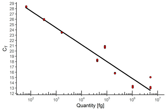 The parameters obtained for the standard curve were as follows: slope: −3.189, intercept (Y): 33.9, R2: 0.939, and efficiency (E): 105.863%, showing satisfactory amplification of the template DNA with the selected primers (Figure 9). Testing dilutions of M. luci DNA further confirmation the high analytical sensitivity of the real time PCR method, since a very low amount of template DNA could be detected. DNA was detected in the range from 66 fg to 129.7 ng of the template DNA in a real-time PCR reaction.