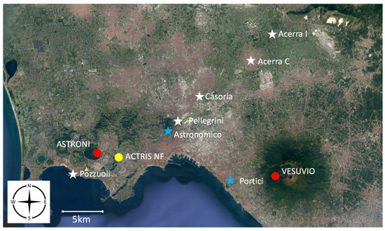 Map of the city of Naples with the location of the Actris National Facility (Actris NF), the Astroni Natural WWF Reserve (Astroni) and the National Park of Vesuvius (Vesuvio). Stars refer to the 7 sampling sites of the ARPAC air quality monitoring network equipped with instruments for continuous measurements of PM concentration.