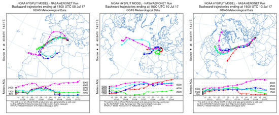 HYSPLIT NOAA model outcomes showing three-day air mass back-trajectories over the measurement area between 500 and 3000 m of altitude. Model results refer to 18.00 UTC of the 8, 10 and 13 of July 2017.