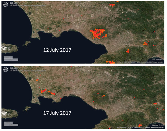 In the same period, on 17 July, the fire also affected the Astroni Natural WWF Reserve located very close to the measurement area. The images of the active fire derived from satellite observations corresponding to 12 July and 17 July 2017 are reported in Figure 5. These local episodes were characterized by high atmospheric turbidity and a strong impact on PM at ground level that reached daily peak values above the limit established by the European Directive (2008/EC/50), which for PM10 sets two limiting values for human health protection: the daily mean value should not exceed 50 µg m−3 more than 35 times per year and the annual mean value should not exceed 40 µg m−3 (http://data.europa.eu/eli/dir/2008/50/2015-09-18 (accessed on 1 February 2021)).