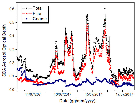 Level 2.0 data of columnar AOD at 440 nm, Ångström exponent (γ) at 870/440 nm, volume particle size distribution dV(r)/dln(r) (µm3 µm−2) and single scattering albedo (SSA) were analyzed with the aim of studying possible changes in the aerosol optical and microphysical properties in the atmosphere in the period 10–17 July 2017. The relationship between AOD and γ parameters allowed us to discriminate different aerosol typologies along the atmospheric column on the basis of their different optical properties [40]. Moreover, aerosol coarse and fine mode fractions obtained from the AERONET spectral deconvolution algorithm [41] and their relative influence were also analyzed for a more reliable characterization.