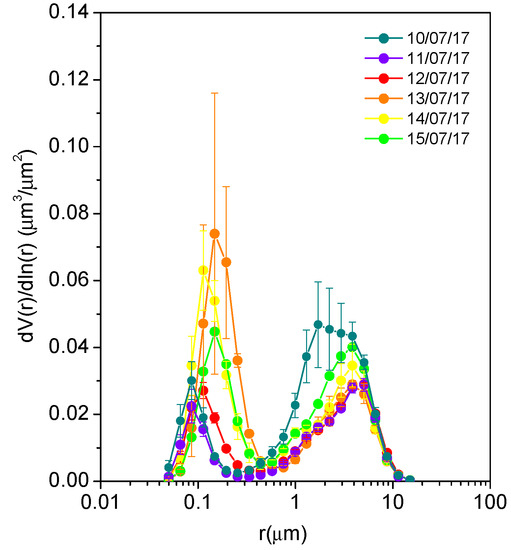 Volume particle size distribution dV(r)/dln(r) derived from the AERONET hybrid inversion data procedure were also analyzed to highlight any difference in the aerosol composition. A representative particle size distribution was obtained by averaging over 24 hours the different size distributions obtained during the day. Figure 9 reports the columnar size distributions dV(r)/dln(r) for the period 10–15 of July; data for 16 and 17 of July are missing. The error bars of the data points in Figure 9 represent the uncertainty calculated as the mean standard deviation. This analysis highlights an interesting variation of the atmospheric aerosol composition during the days affected by fire events, showing a reduction in coarse mode aerosol components together with a larger predominance of fine particulates. According to Saharan dust transport events, a larger contribution of coarse mode fraction aerosol was present on 10 July, whereas on 12 July, a fine aerosol contribution was added to a similar content of coarse mode aerosol due to Saharan dust mixing with biomass burning aerosol. It is worth noticing the shift and increase in the peak value of the fine mode components for 13–15 July as a consequence of the arrival of biomass burning aerosols in the measurement area.